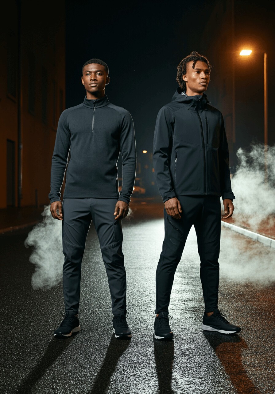Advanced stretch properties and water-resistant materials create garments that perform in any environment. Clean lines meet real-world function.