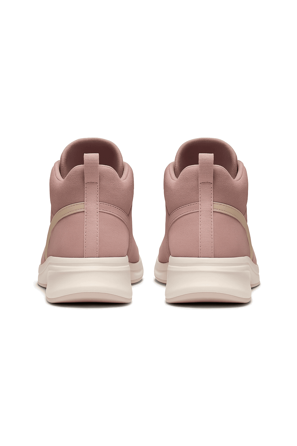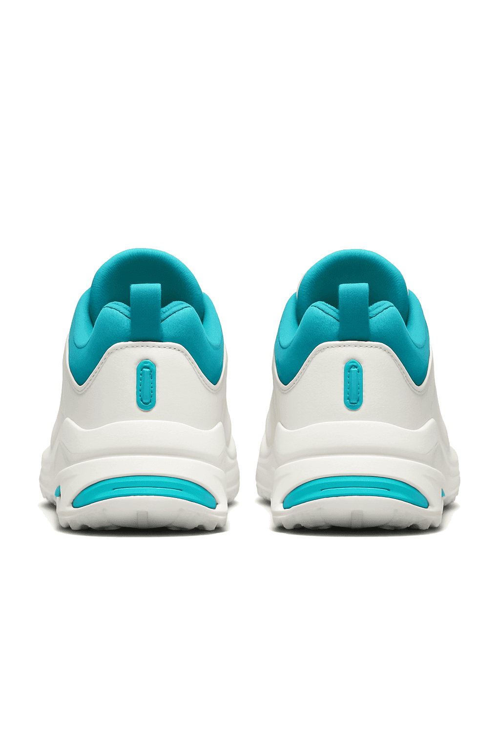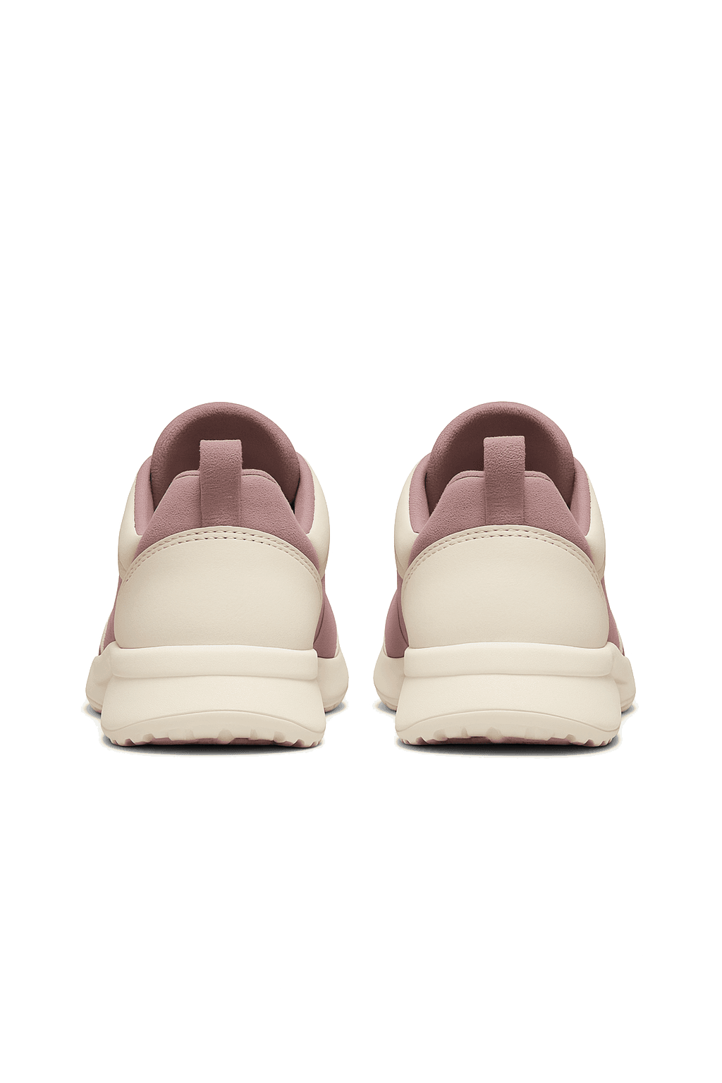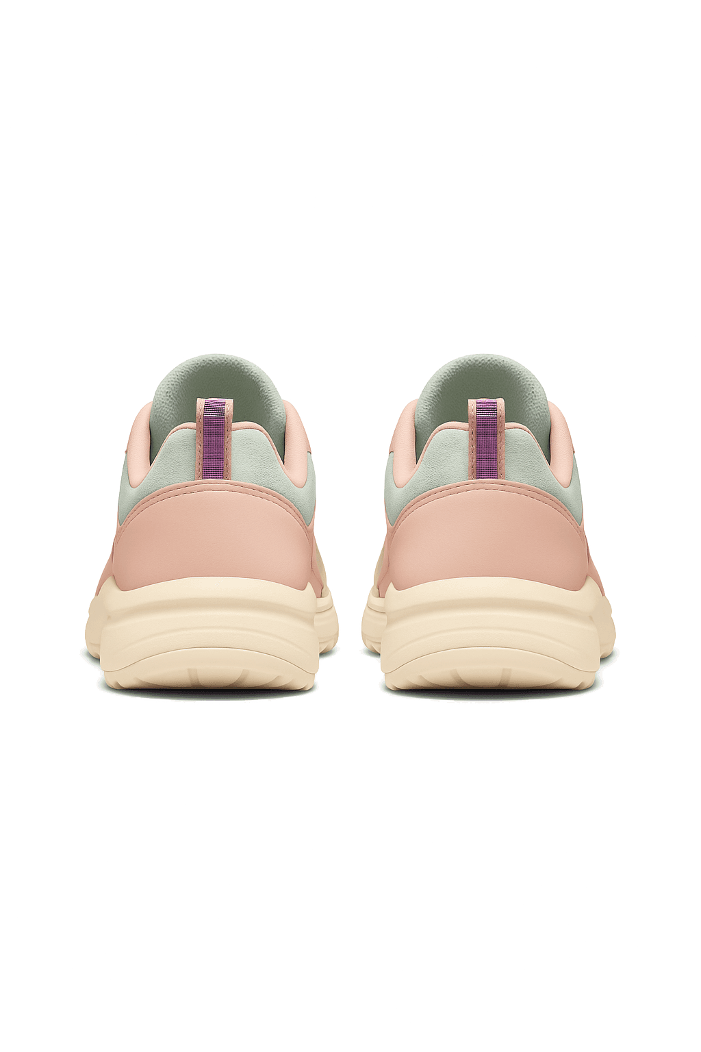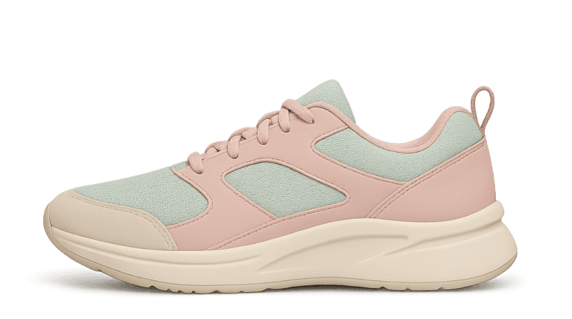 Close-up of light grey and pastel blue sneakers worn with pink socks and cropped white trousers, shown on a concrete surface.