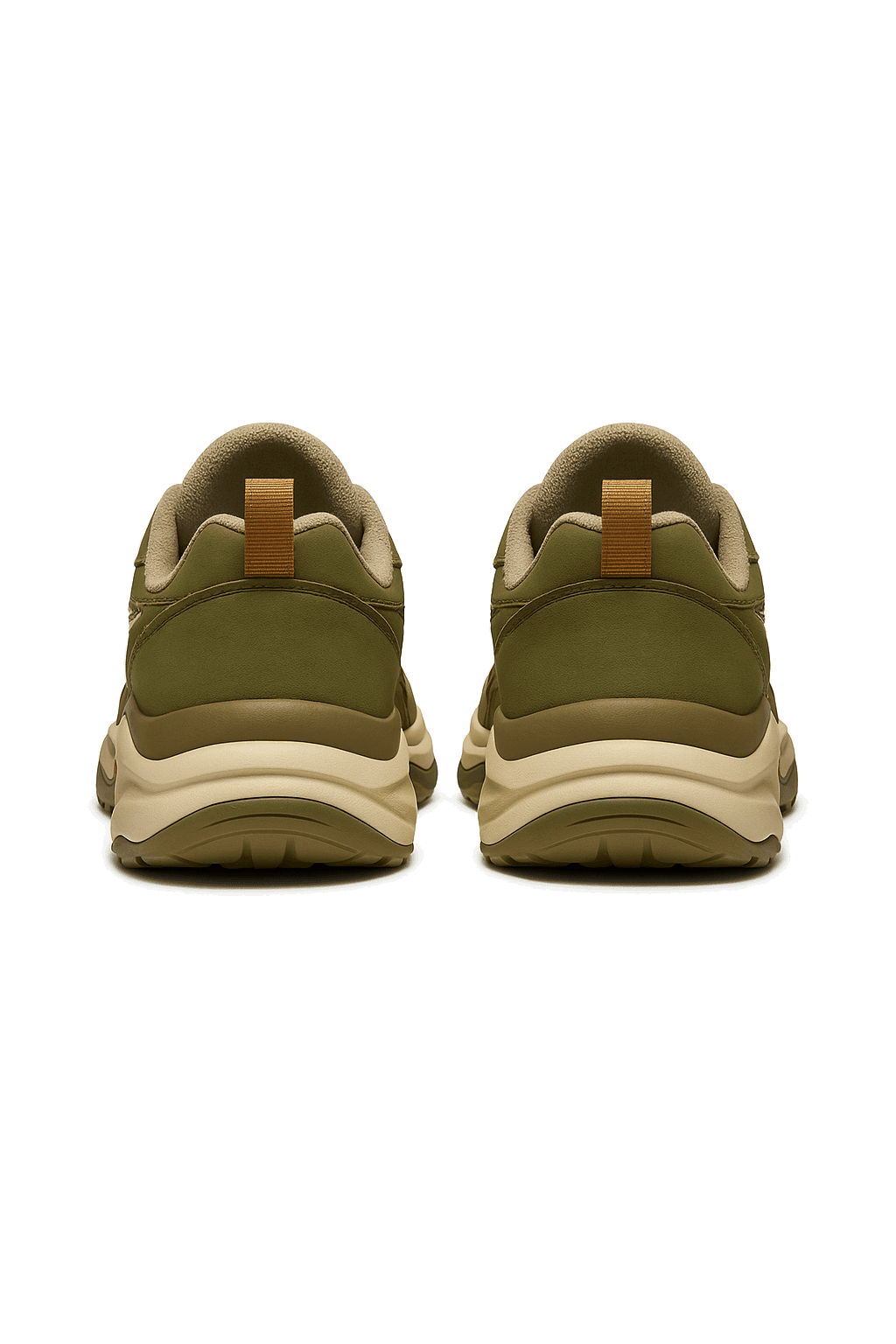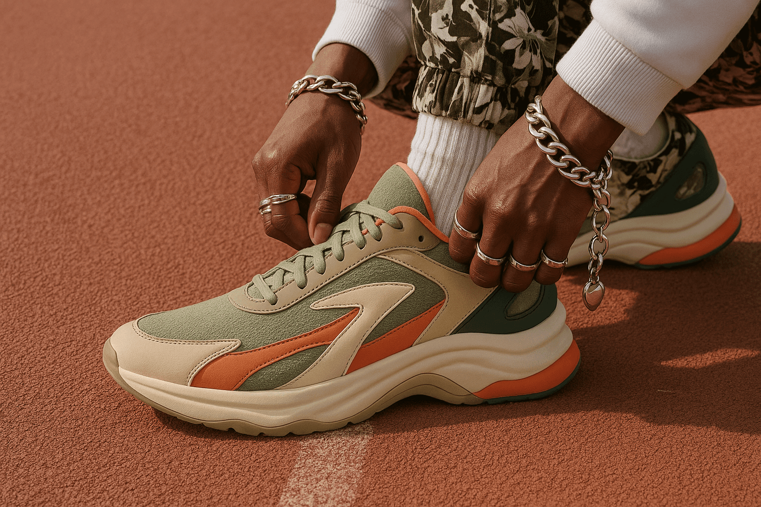 Close-up of hands adjusting green, cream, and orange Trailblaze Runner sneakers with bold sole design, worn on a textured red track surface.